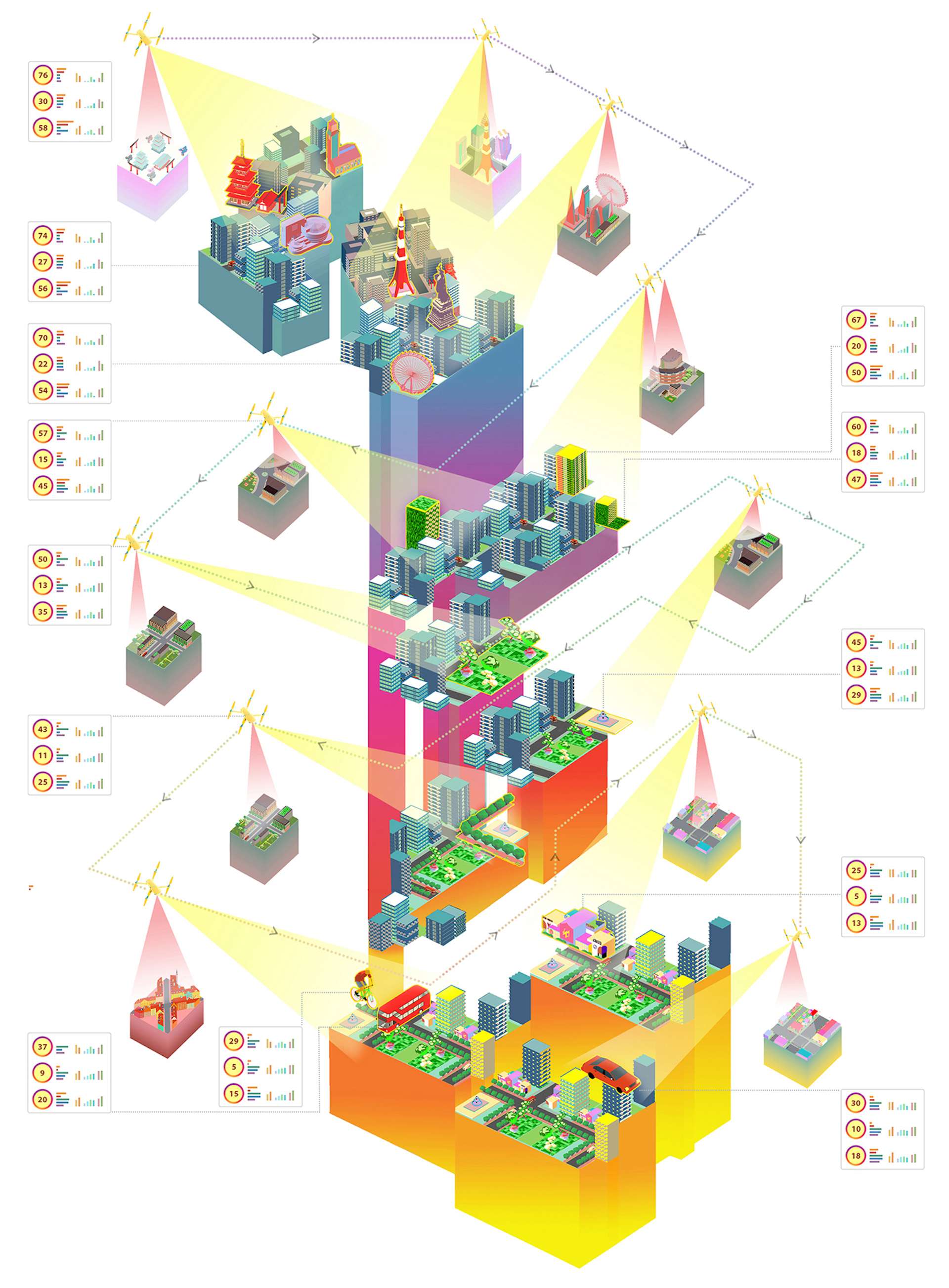 AF I relied on Kevin Lynch’s concept of Imageability to abstract the city. Some of the key elements that add to the imageability of the city were considered for abstraction. For instance, the grid layout and palm tree flanked boulevards very much add to the imageability of LA, whereas radial roads, squares, terraced houses and the iconic red bus are few elements that adds to the imageability of London and the iconic towers, urban shrines and Mount Fuji in the background add to the imageability of Tokyo.
