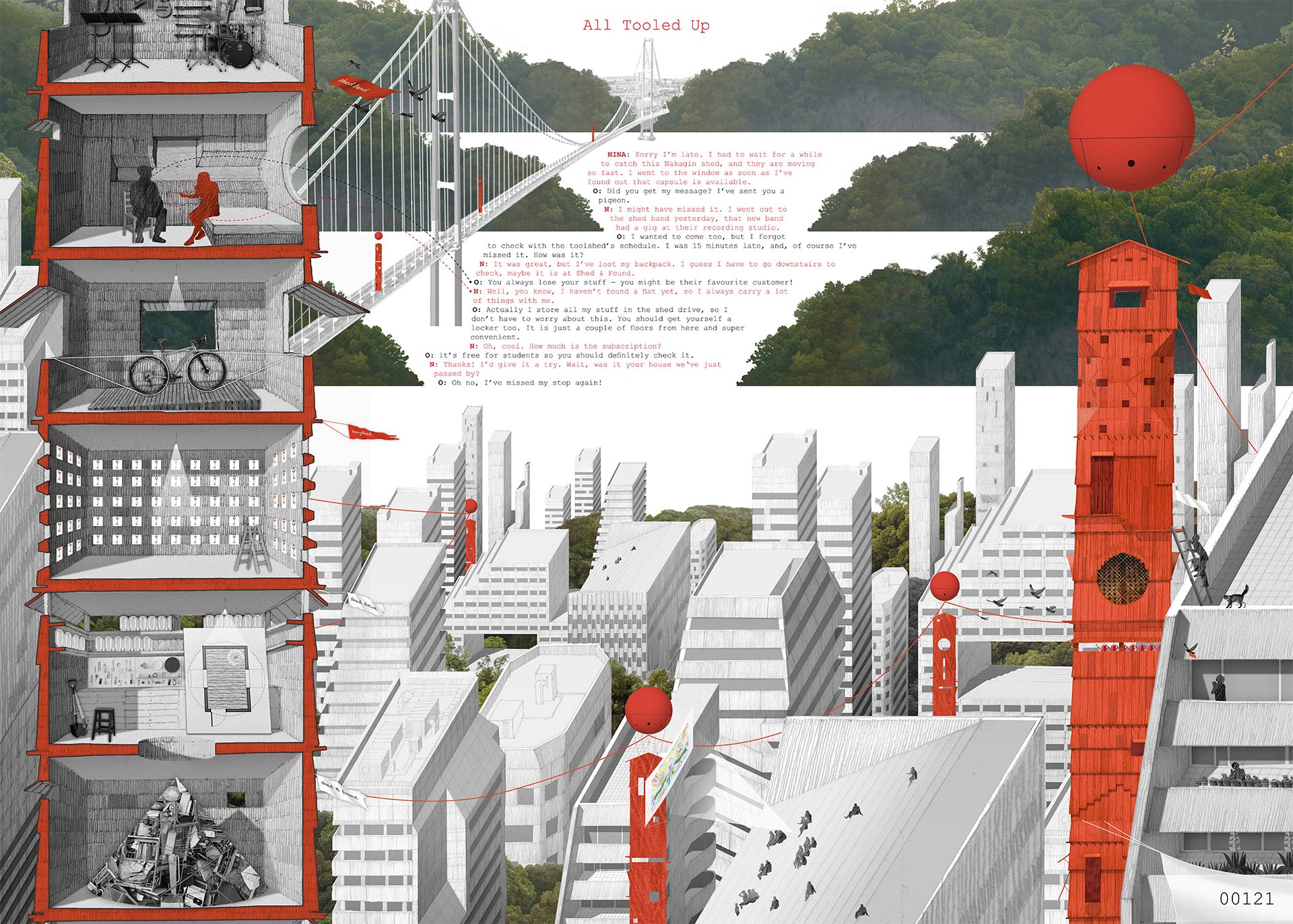 The project imagines how the tool sheds would be used if they survived urbanisation. This hypothetical city is analogue: in such a setting the tool shed is a necessity. As the houses evolved into blocks of flats, the sheds would have also become multi-storey structures to include new services. The sheds move through the city like public transport, following a schedule. To get all tooled up, city dwellers just need to pop out of the window in time.