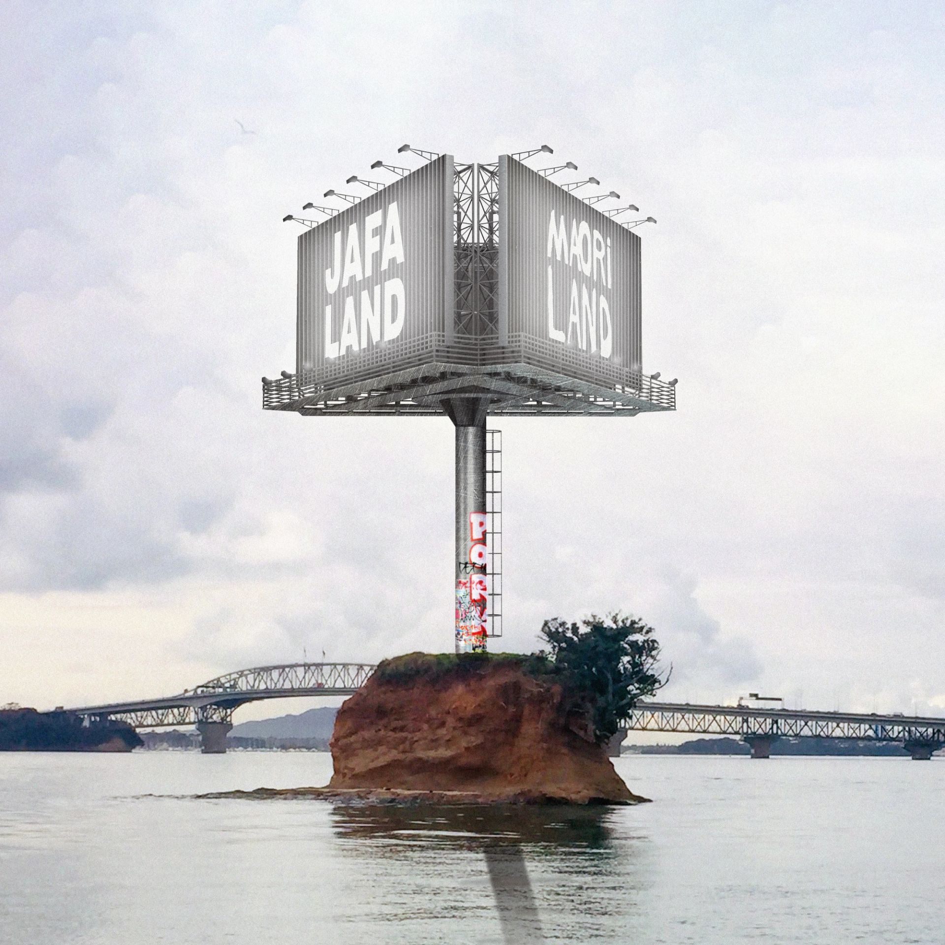 AuckLAND proposes a three-sided billboard on a small chunk of dirt parallel to the city's Harbour Bridge, A.K.A Watchman Island. The work depicts various perspectives on Tāmaki Makaurau Auckland, Aotearoa, New Zealand, lying between serious, satirical and sardonic. The typography is hijacked from the book cover typography of Auckland, their Auckland (1983) and Way of the JAFA: The Guide to Surviving Auckland (2004) (JAFA is an acronym used by rural folk to describe Auckland citizens as "Just Another Fucking Aucklander"), as well as a prolific image of a 1977-78 Māori Land protest banner at Bastion Point. The billboard (like most) begs to be vandalised, most likely by the infamous graffiti artist: Porker, the city's most prevalent outlawed artist... likely turning "Auckland" to "Porkland". This collage-rendered image encapsulates the author's current Master of Architecture thesis, which interrogates architecture research that encounters politics, humour and identities unique to Aotearoa, New Zealand; in this instance, AuckLAND is a provocative polemic paper project proposed to occupy the main cities Waitematā Harbour, to confront motorists, residents and boaties alike.