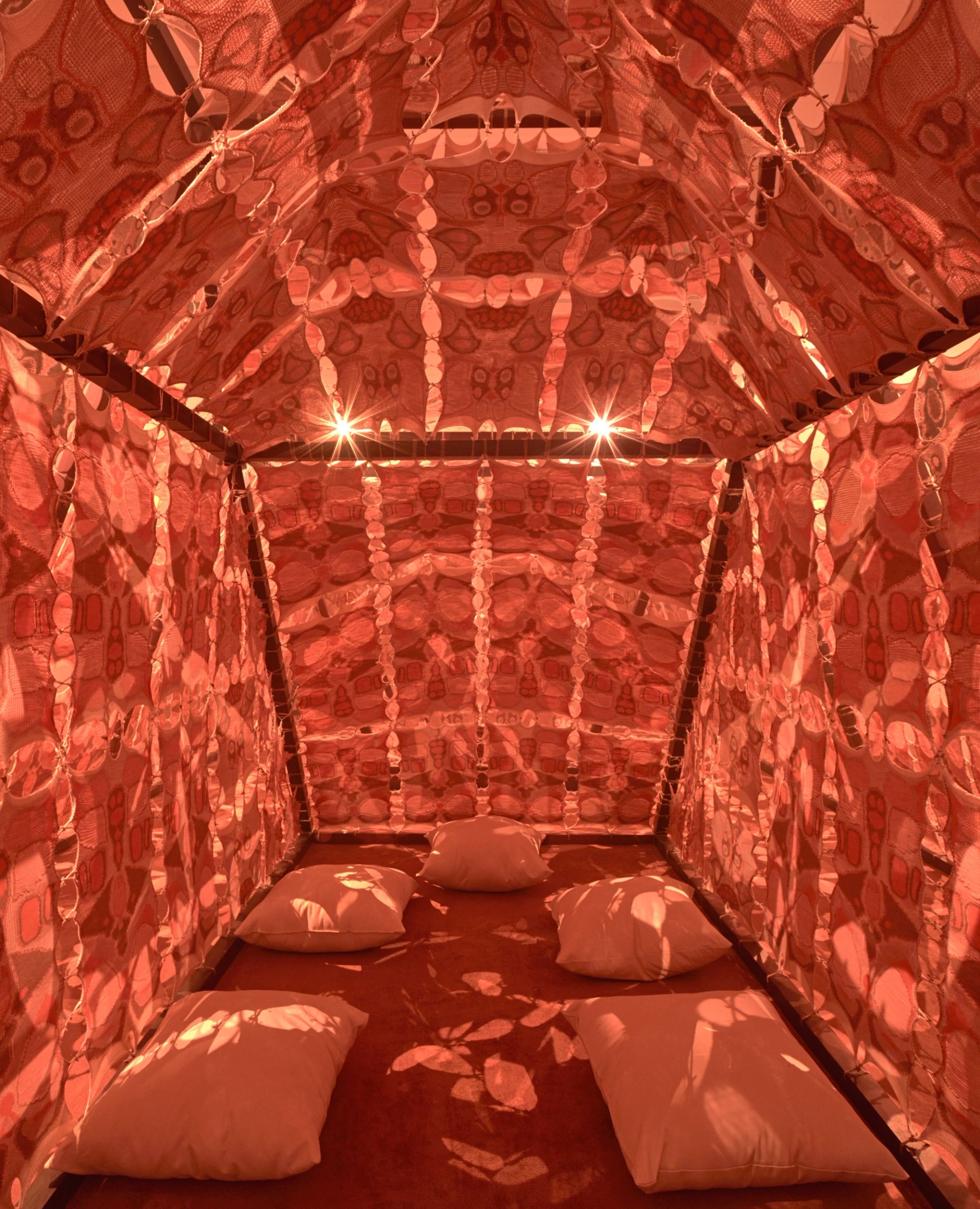“JABALA: 9 ASH CLEANSING TEMPLE” is a living architectural entity for homing non-human life and endangered species in the womb of a sacred mountain. It honours ephemeral rituals across architecture, performance, and art within Bedouin, Yoruba, and Cherokee communities that respect the natural world and practice environmental consecration. The temple is composed of jute, hemp, and cotton yarns knitted into fabric — chosen for their skin-like quality, porousness, and scalability.