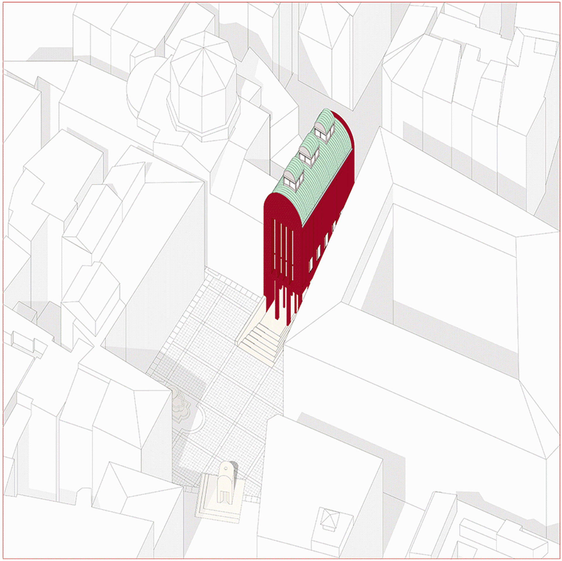 Piazza delle Cinque Scole is located in the historical center of Rome at the edge of the former Jewish ghetto. The piazza is in a state of non-use due to the area’s reconstruction around 1900. The project seeks to reactivate the piazza through the intervention of a library and a re-interpretation of its surrounding urban space. The building comprises three main spaces: an open-air ground floor, a main library room, and an intermediate lobby space. The ground floor is sunken into the earth with stairs which can be used as a place for seating, gathering, and performing.