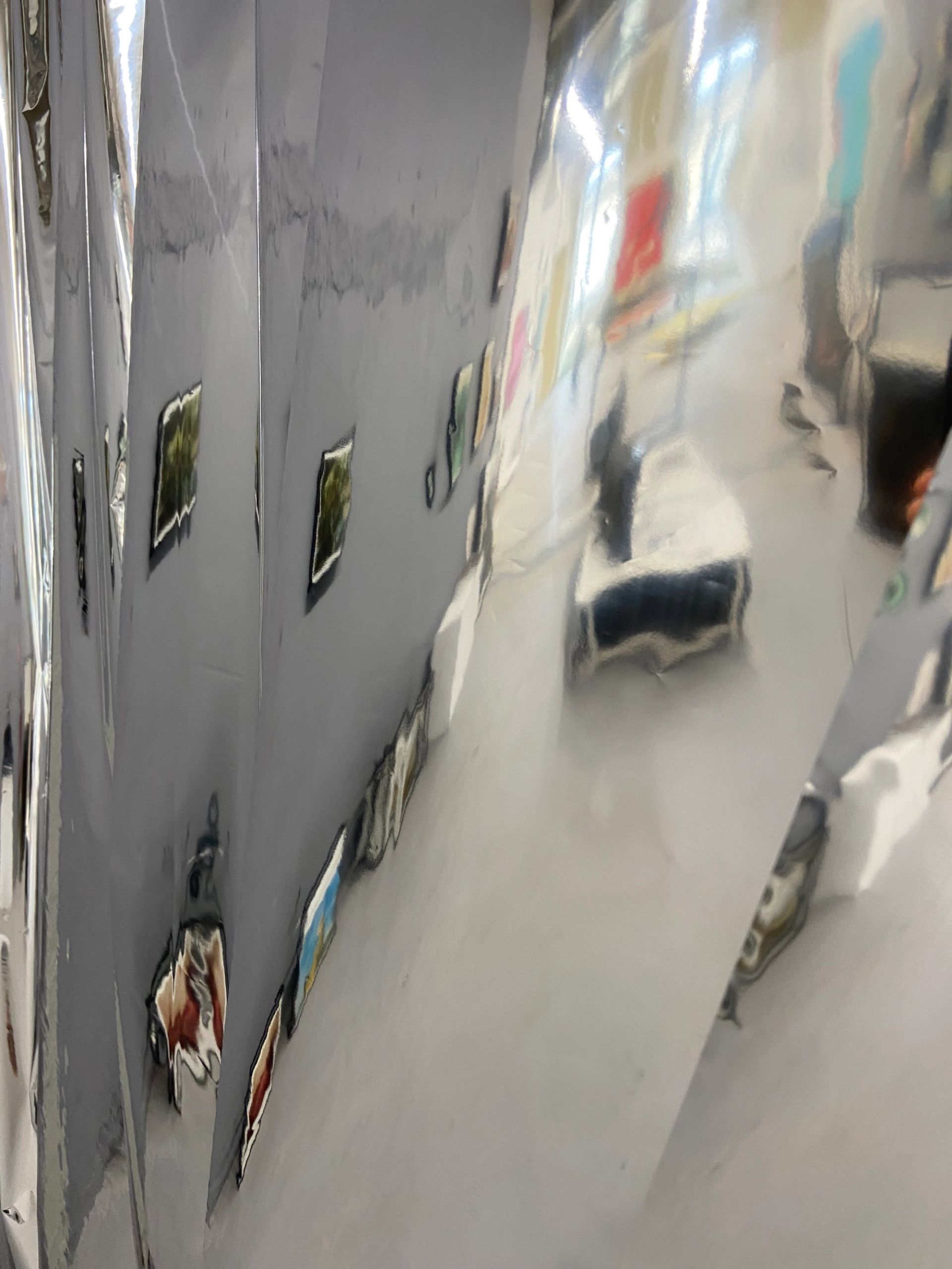 To achieve this, the entire LIQUID WALLS installation in the 3537 space in the Marais, Paris was built out of recycled aluminum foil, creating walls that forced the public through a narrow corridor. As they catch a glimpse of their distorted reflection, people move through the installation, from one side of the exhibition, to the other.