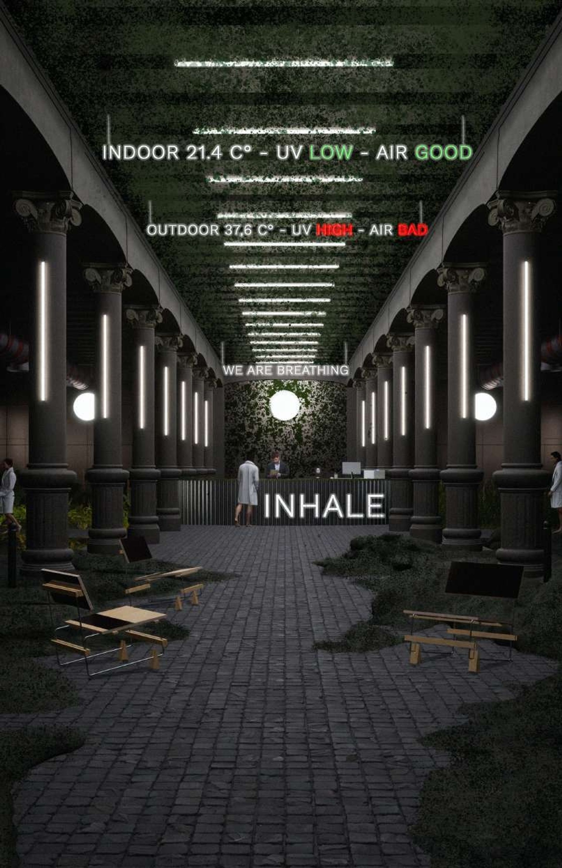 "We imaged 2040 Milano. Temperatures increased significantly. Marrakech is not that far anymore. We imaged a possible scenario where we were allowed to seal the TUNNELS. Cars are gone. Even the electrical. They stayed for a while. Nature can grow. Water, musk, lichens. A micro-climate, a micro-environment for human safety.
