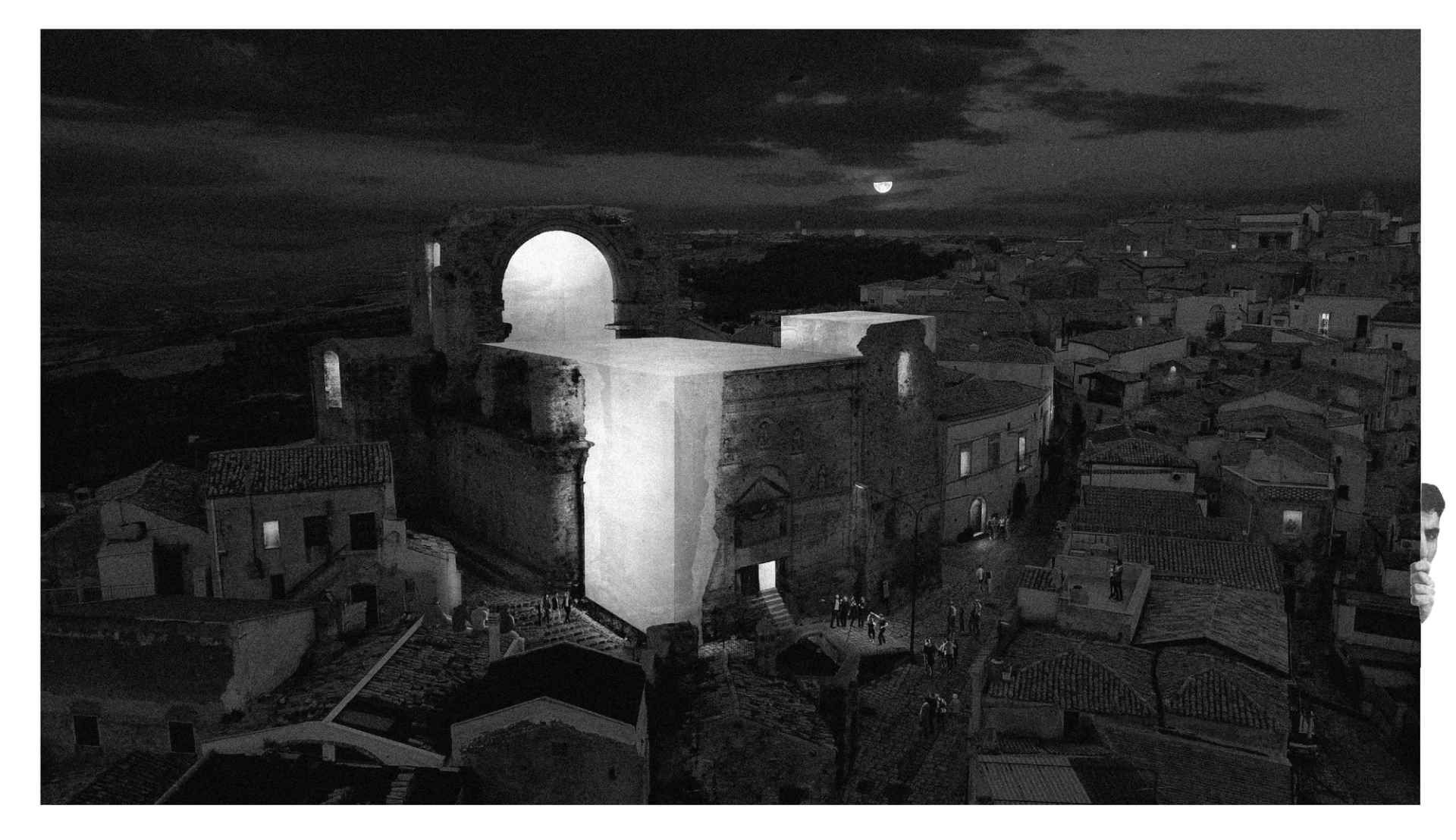 The drawing depicts the proposal by Julia Giżewka, Jerzy Wojewódka and Jacub Jopek, winner of the 3rd position at the "Reuse the Fallen Church" competition, 2021.