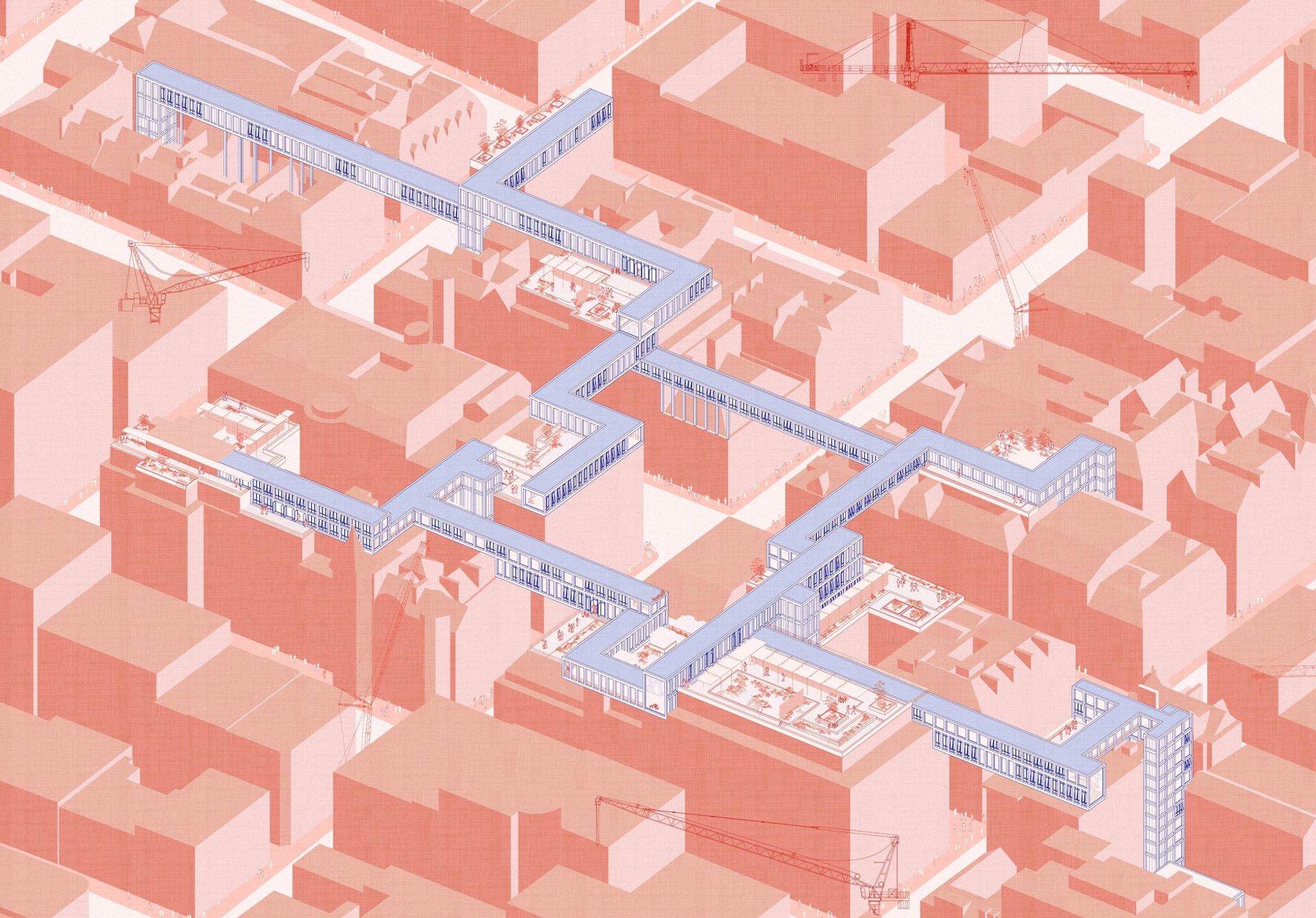 The elevated urban infill brings to light the insufficiency of the current city development model. It aims to invoke for a scheme with the least environmental impact and the most efficient use of what already is there but often neglected - from roofscape to alleyways, while ensuring a pleasant neighbourhood through resilient place-making approach, embedding the new within the old.