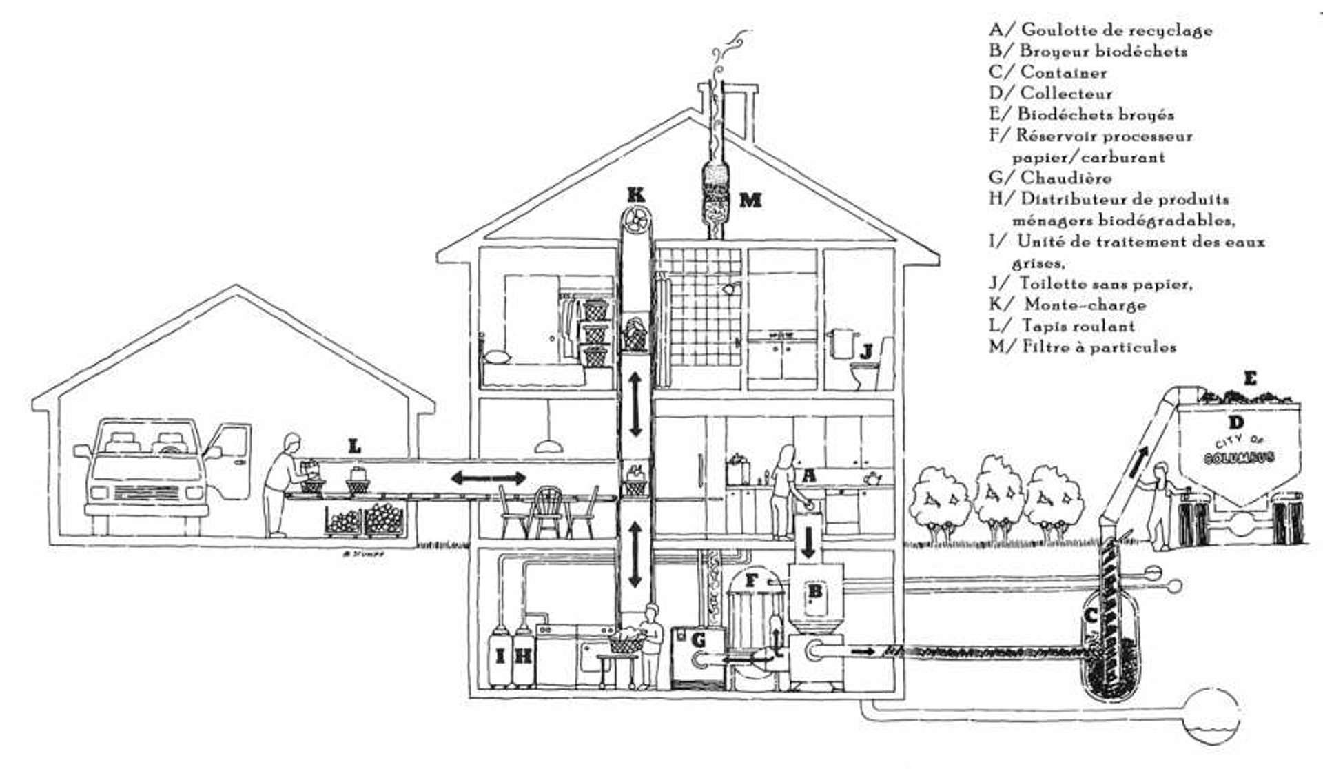 This experimental home occupies most of the curatorial exhibition and is composed of seven installations that qualify each of its rooms, all divided by permeable filters (Fig. 2). Floor signs provide an additional layer to the reading of the exhibition’s space; they not only clarify the function of each room (conventional names such as kitchen, living room and garage are used and written at the entrance of each space), but they also draw connections between rooms and food-related processes (Fig. 3). The curators were inspired by William Stumpf’s 1989 Metabolic House (Fig. 4) whose mechanised design was centred on the management of the bio-waste of a fairly common dwelling. Contrarily, the “Metabolic Home” abandons anthropocentric design solutions by discarding its most exemplary room: the bedroom.