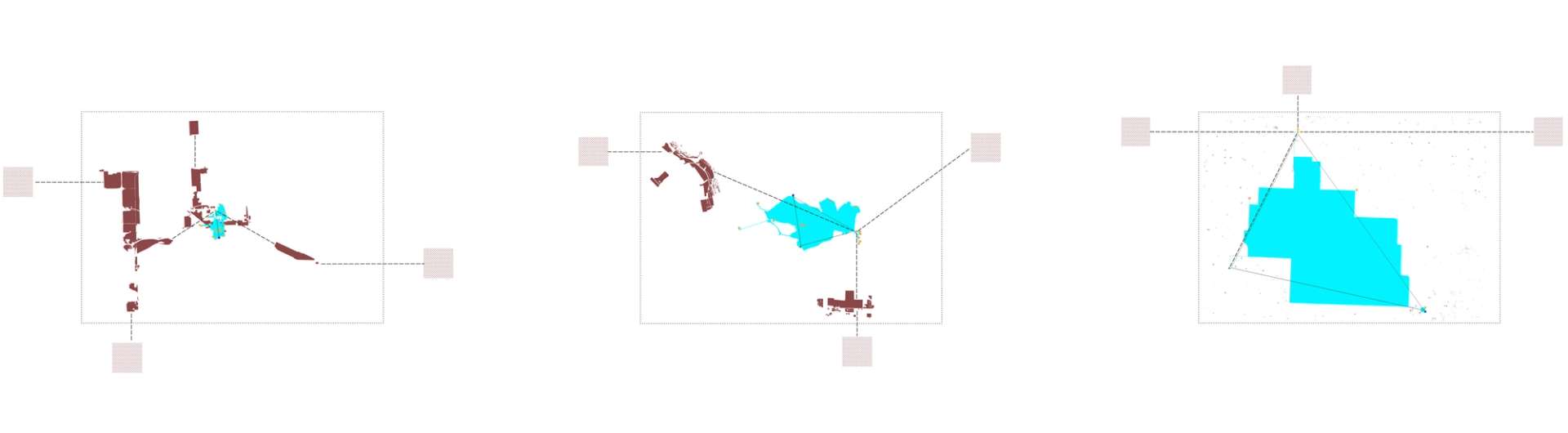 Within a consumer economy, the path of the carbon subject traces lines between home, work, and sites of consumption. Distant lands and people deliver energy, food, and commodities. This is the logic of carbon form. These drawings show this logic at work within settlement patterns of different densities: Miami, FL, San Diego, CA, and Hardin County, IA. Although each site has different spatial characteristics, these drawings nonetheless reveal a shared logic, one that has a distinct and replicable form. From “Form, Pattern, Rule: Elements of Territorial Carbon Form,” Outside Development and Alican Taylan, with Adare Brown, 2023.