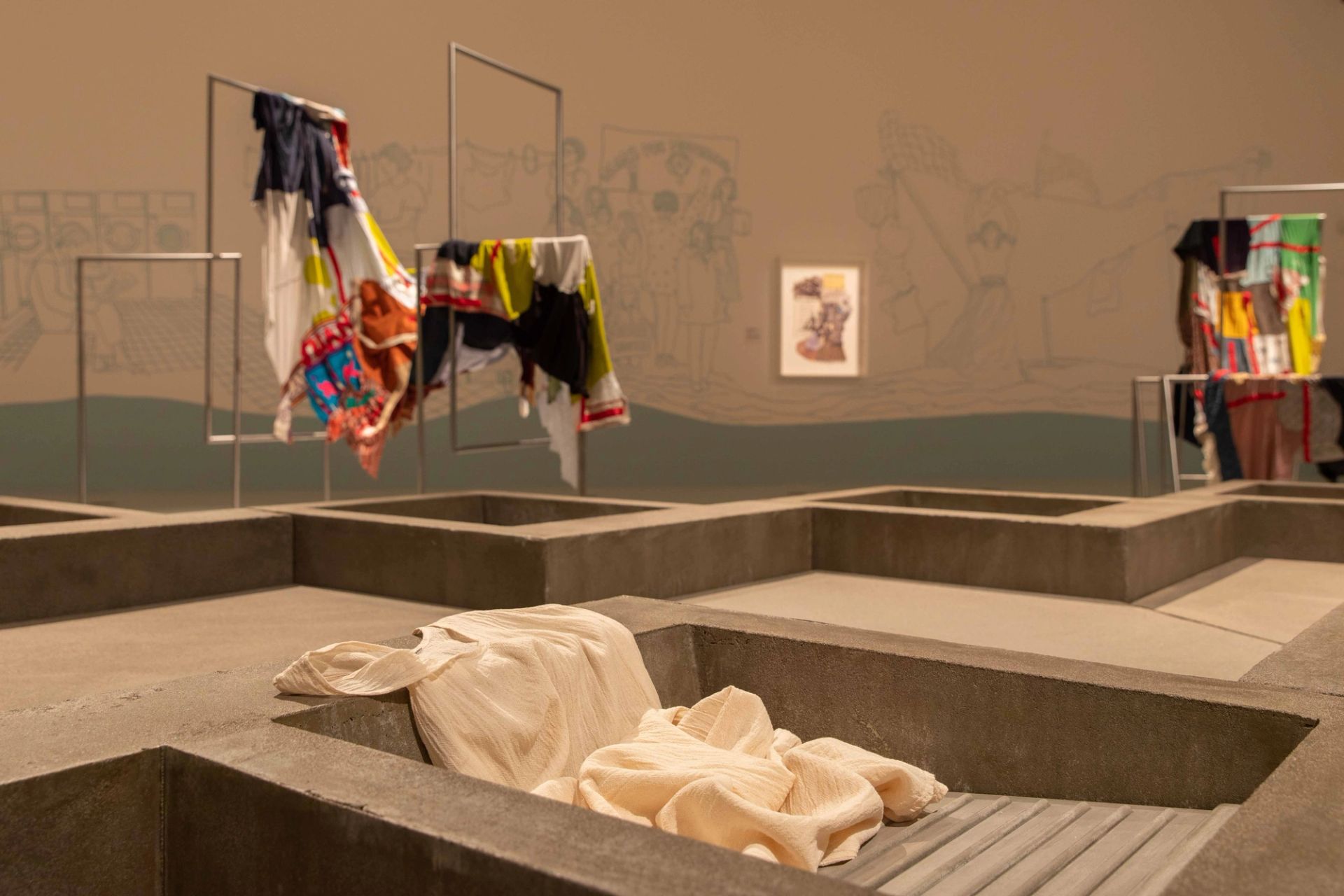 KOOZ That’s the dream, right? To create a framework in which the occupants can inscribe their own form of life. I wanted to hear about the installation La ropa sucia se lava en casa at National Gallery of Victoria in 2022. My Spanish is not great but that translates to “dirty laundry is washed at home,” right? For me, it speaks to a lot of things, not only about the public-private divide, but also about domestic labor and questions around the contours of the family.