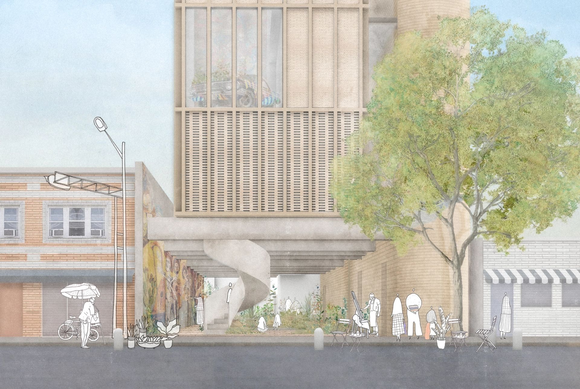 Bilbao’s proposal for Xola (2023–ongoing), a mixed-use affordable housing complex in Boyle Heights, Los Angeles, diverges from convention by replacing commercial frontage with a six-story art museum. Behind it rises a ten-story residential block with 19 affordable units.