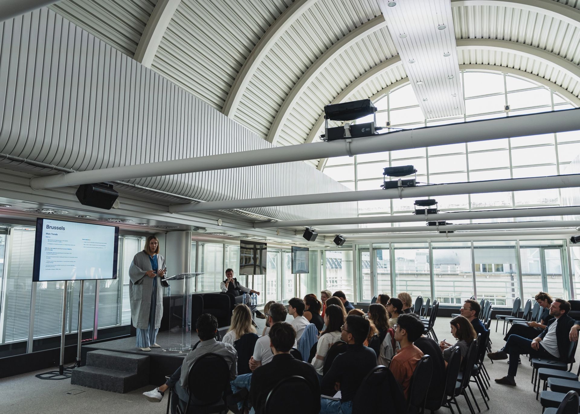 Valérie Vermandel of Whitewood introduces the Holcim Foundation Fellows to their Cityforward project, the ambitious transformation of 21 former European Commission buildings, within the vaulted space of one of them in the European Quarter in Brussels. © Holcim Foundation