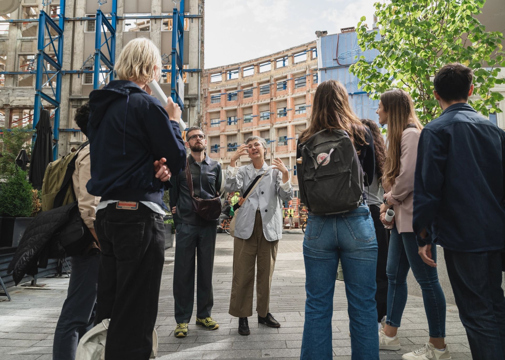 An Fonteyne, architect of KANAL Centre Pompidou, takes the Fellows on a walk through the city towards the construction site of KANAL addressing the accessibility of public space and the cultural and material potential of existing structures for it. © Holcim Foundation