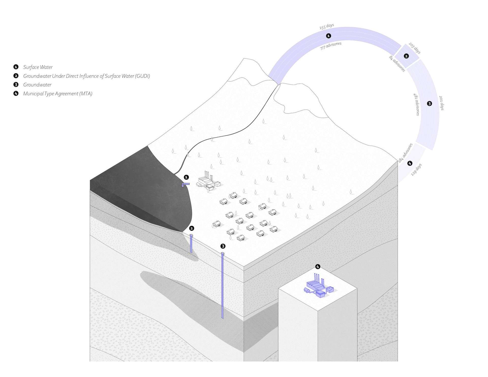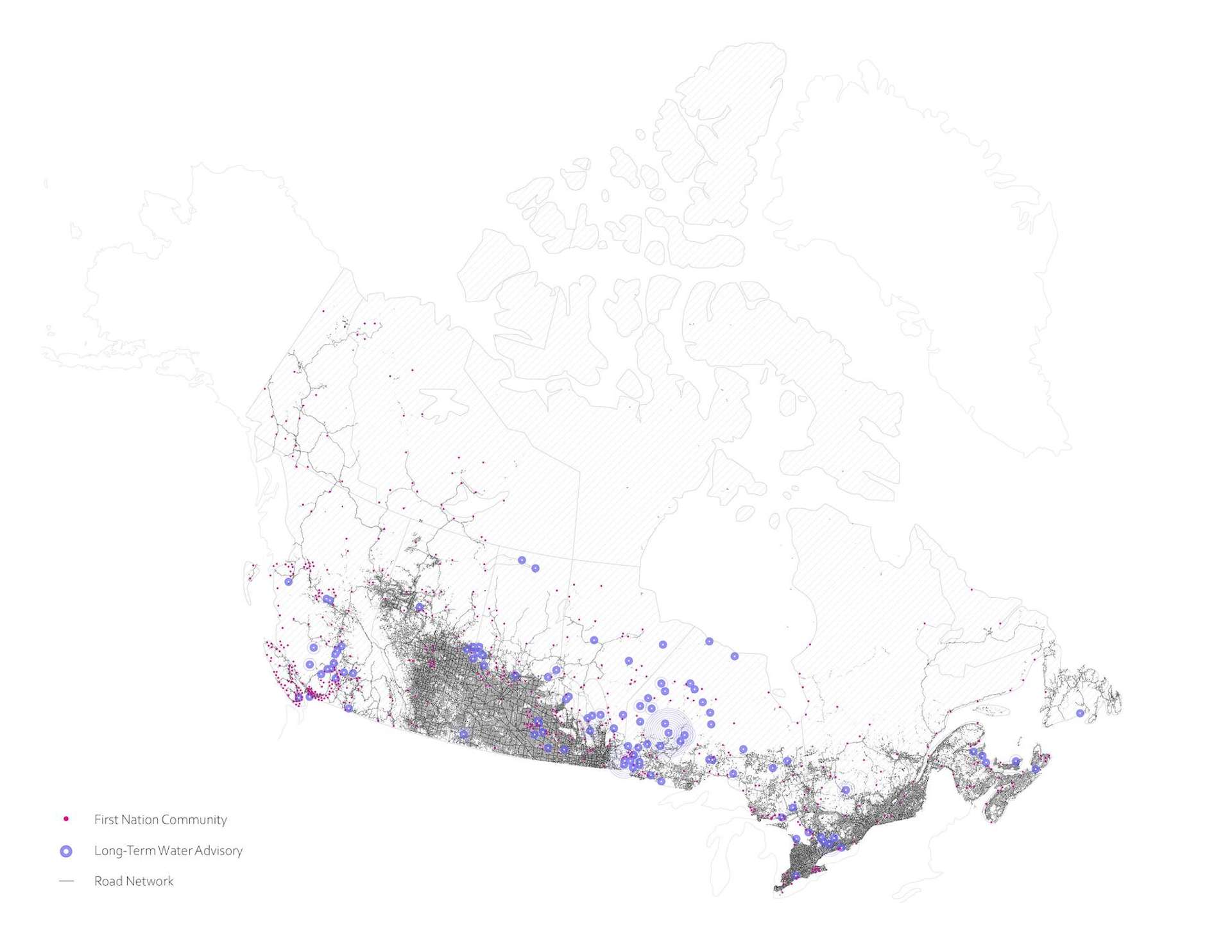 Canada’s Indigenous communities are at a disproportionately higher risk of living with deficiencies in their water systems. Federal government-led programs have failed to address the fundamental, historical issues found in these communities, and year after year have left many Indigenous communities without safe or reliable access to clean drinking water. Architects have the research capabilities and representational tools at their disposal to present a clearer picture of the water crisis. By using these tools to properly understand the issues contributing to the crisis, this thesis posits that architecture has the agency to propose informed, site-specific design strategies that truly work towards the goal of providing Indigenous communities with sustainable access to clean drinkingwater.