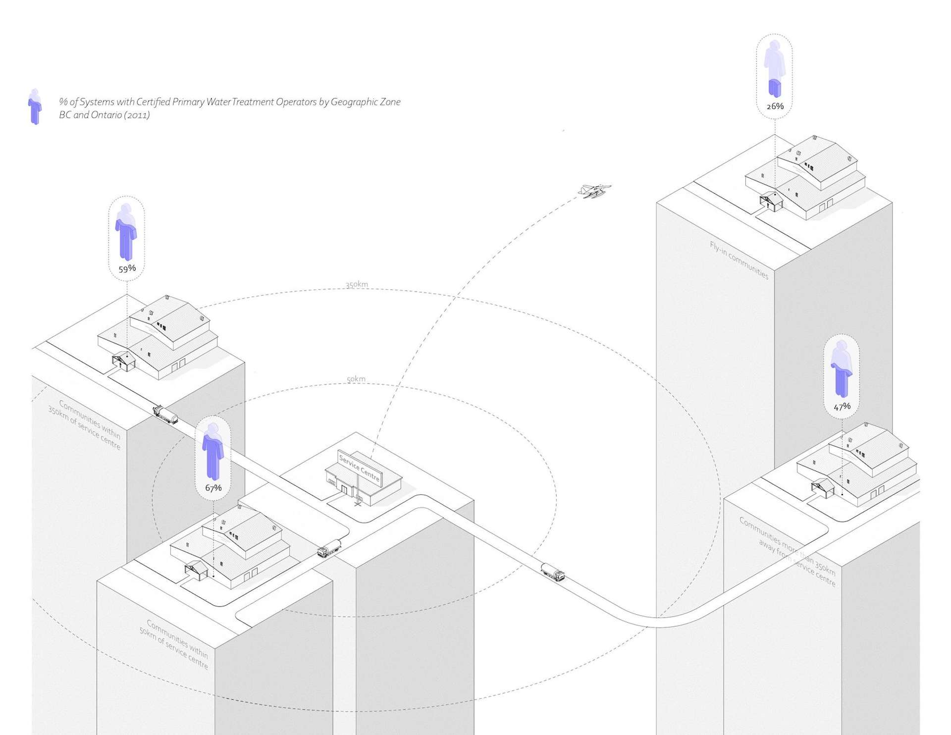 JH The clean water crisis is an overwhelmingly complex issue with many contributing factors. Research and architectural representation are critical in painting a clearer picture of the crisis to better understand what issues are present in these Indigenous communities. By using research and representational tools to properly understand these issues, this thesis posits that architecture has the agency to propose informed site-specific design strategies that truly work towards the goal of providing Indigenous communities with sustainable, reliable access to clean drinking water. For the sake of this project, I focussed on three issues present in many communities across the country to better understand if and how design could play a role in providing sustainable access to clean water: Distribution and infrastructure challenges in sprawling communities, a lack of certified water treatment operators, and contaminated source water from ineffective wastewater treatment.