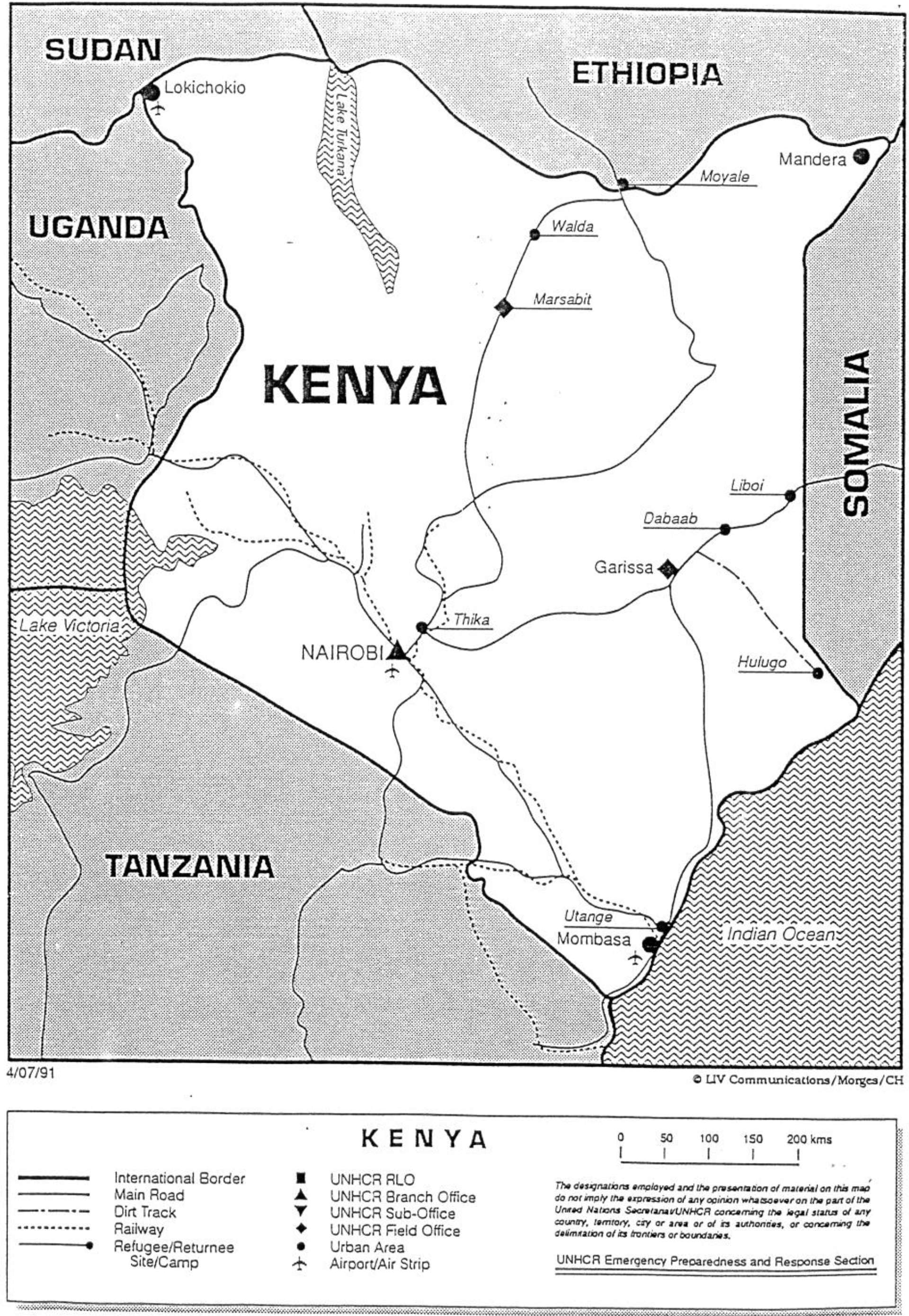 Map of Kenya, technical mission for site selection and planning of Ifo and Walde Camps for Ethiopian and Somali refugees.