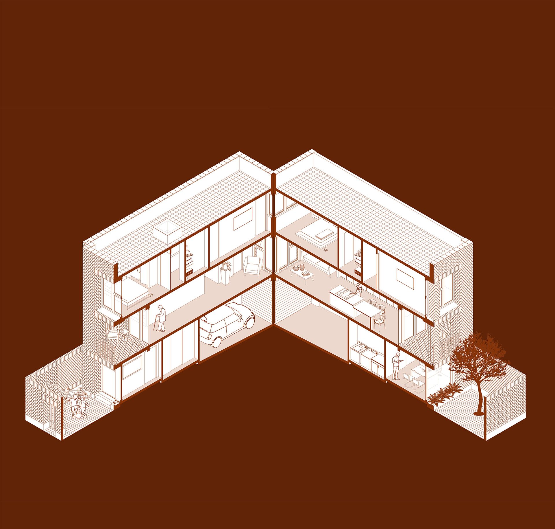 Up until the mid 1980s, Guatemala City extensively used brick construction for its housing.This subtle material reflected an immediate connection to place and supported an industry of craftsmen that produced the material itself. In an effort to revive this tradition, Allora explores brick construction and its implications on urban form and composition. The proposal develops an urban plan composed of 5 housing types that vary depending on their location. The precise dimensions of the units are conceived and linked to the basic dimensions of a single brick (9x14x29cm) to avoid the “cutting” of any bricks on site.