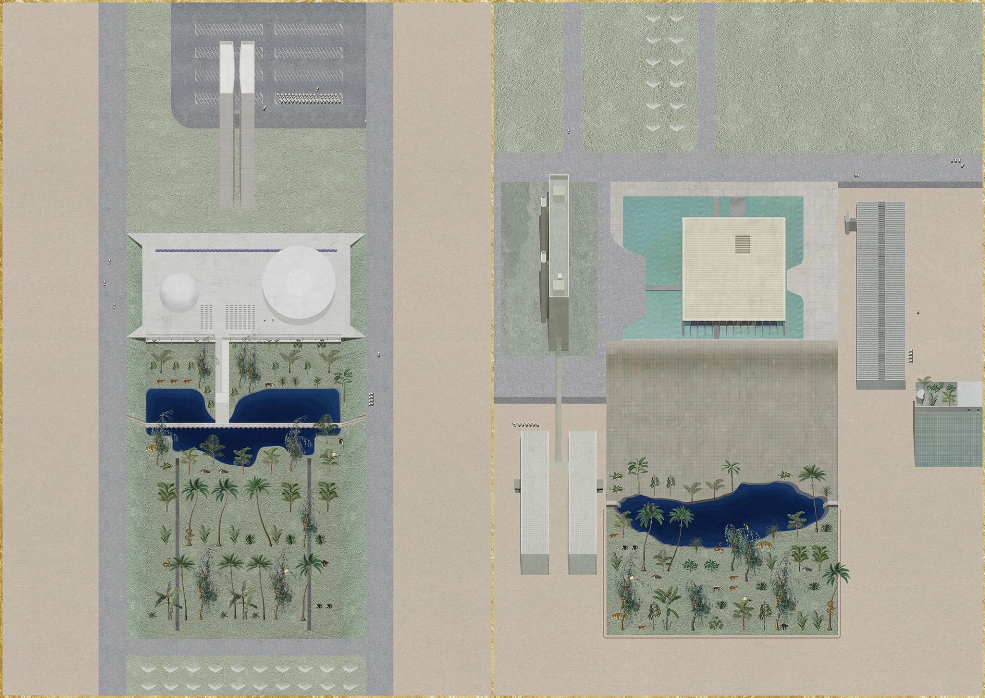 The diptych is part of a project initiated around my observations while visiting Brasilia’s more and less known administrative landmarks. It comments on the incorporation of fragments of the Amazon flora into the recently built capital, hundreds of kilometers away in a very distinct ecosystem. Reminiscent of dioramas and centuries old exhibitions of catalogued species, these indoor gardens were carefully composed and displayed into dim bureaucratic interiors, and appear to perform as vitrines of national capital. The project proposes a series of scenarios in which the fossilised, perspectival and disproportionate character of the city interacts with the invasive and disorienting character of the Amazon.