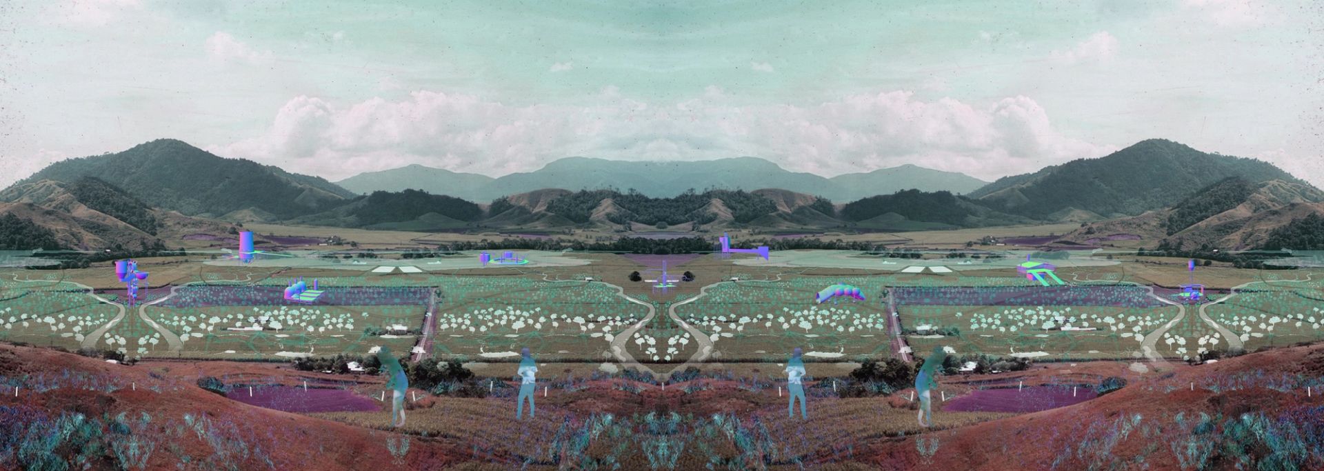The image is an animated tableau depicting an agricultural area in the catchment area of the Great Barrier Reef transformed by the insertion of projects from the Master’s design studios Architecture Under Dispute and Factory of Hyper-ecologies. The projects was developed by students Charles Curtin, Miguel Luis Gilarte, Marta Grbic, and Isaac Harrisson in 2019.