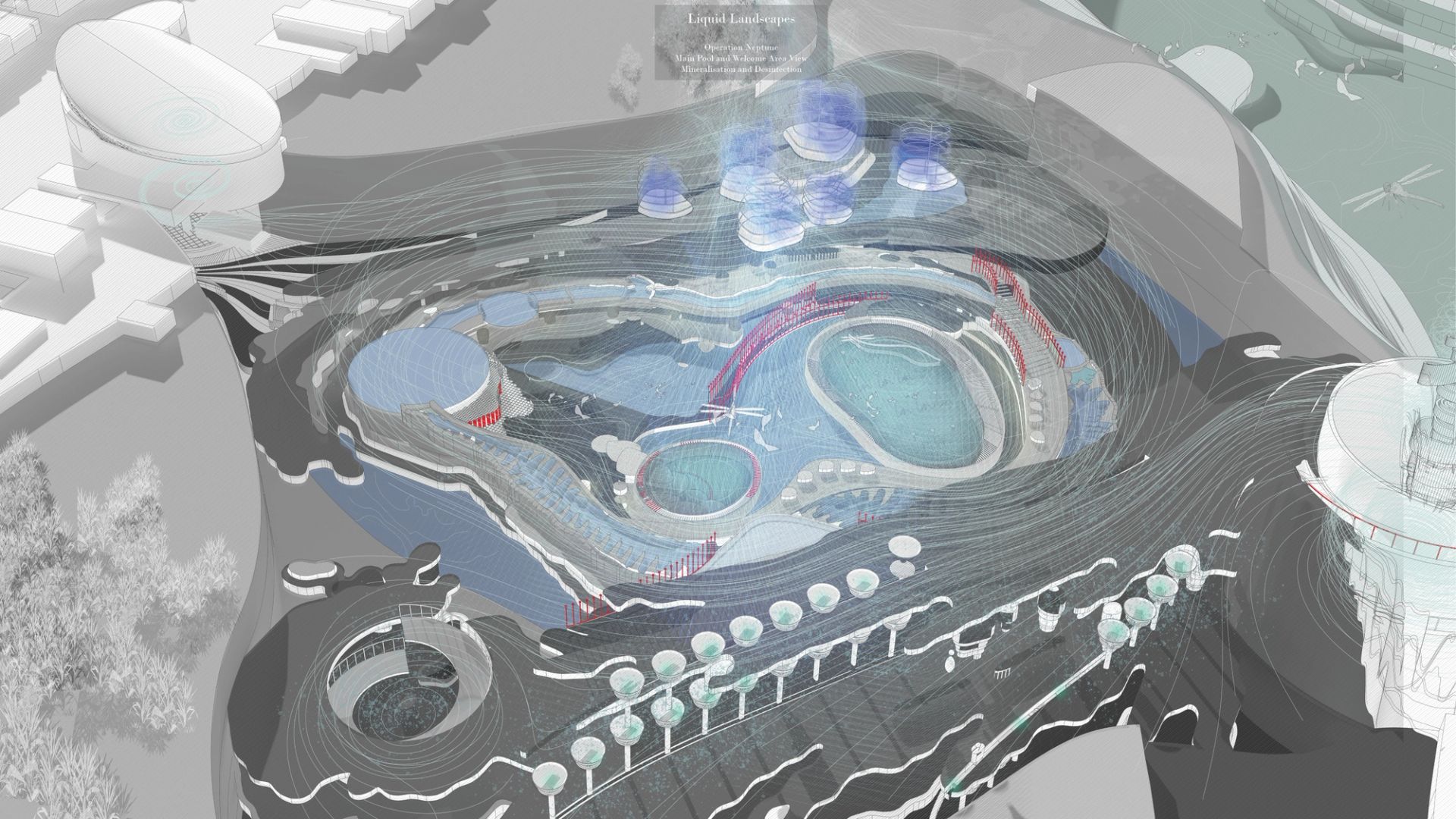The Liquid Landscape is a prototype for a ‘proving ground’ of the declining water security due to climatic anomalies, especially in an already water-stressed area of England (Kent). To tackle that, water management companies propose reducing leakage, building resilience through water catchment as well as a decreasing per capita consumption. The proposal is focusing on creating catchment variety through air and land (condensation, rain, and flood) as well as supporting public engagement and education by creating a public mixed-use infrastructural park.