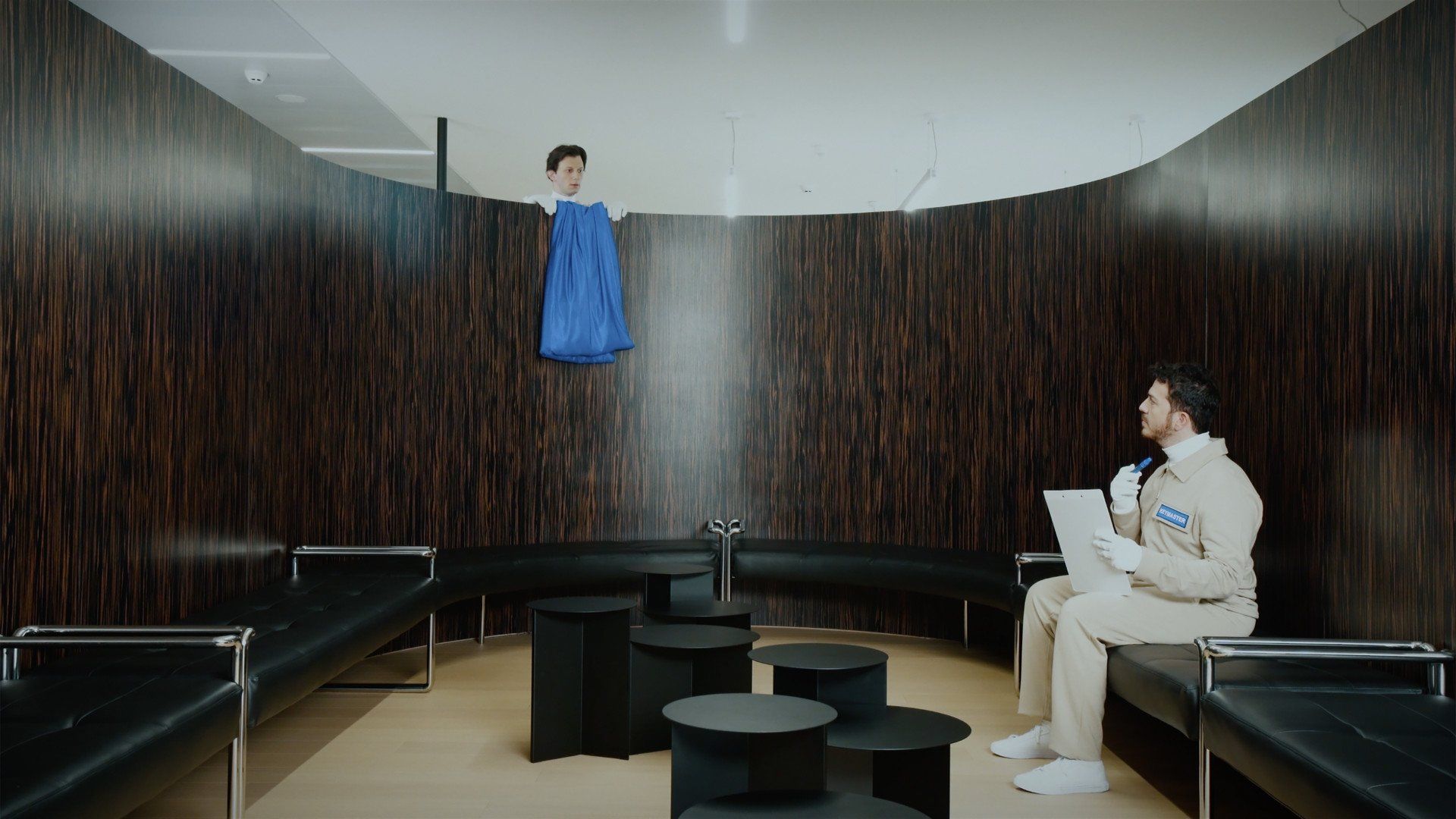 Two weird technicians, KEYMASTER and GATEKEEPER, walk undisturbed through the spaces of a large office building, newly completed but still uninhabited. Undisturbed they install large blue screens on different floors and in different rooms, without speaking to each other. Having completed their work, the two look at each other and, after a gesture of understanding, the GATEKEEPER presses a special blue button: with a glitch, all the blue surfaces installed in the building are activated and turn into portals ready to be crossed...