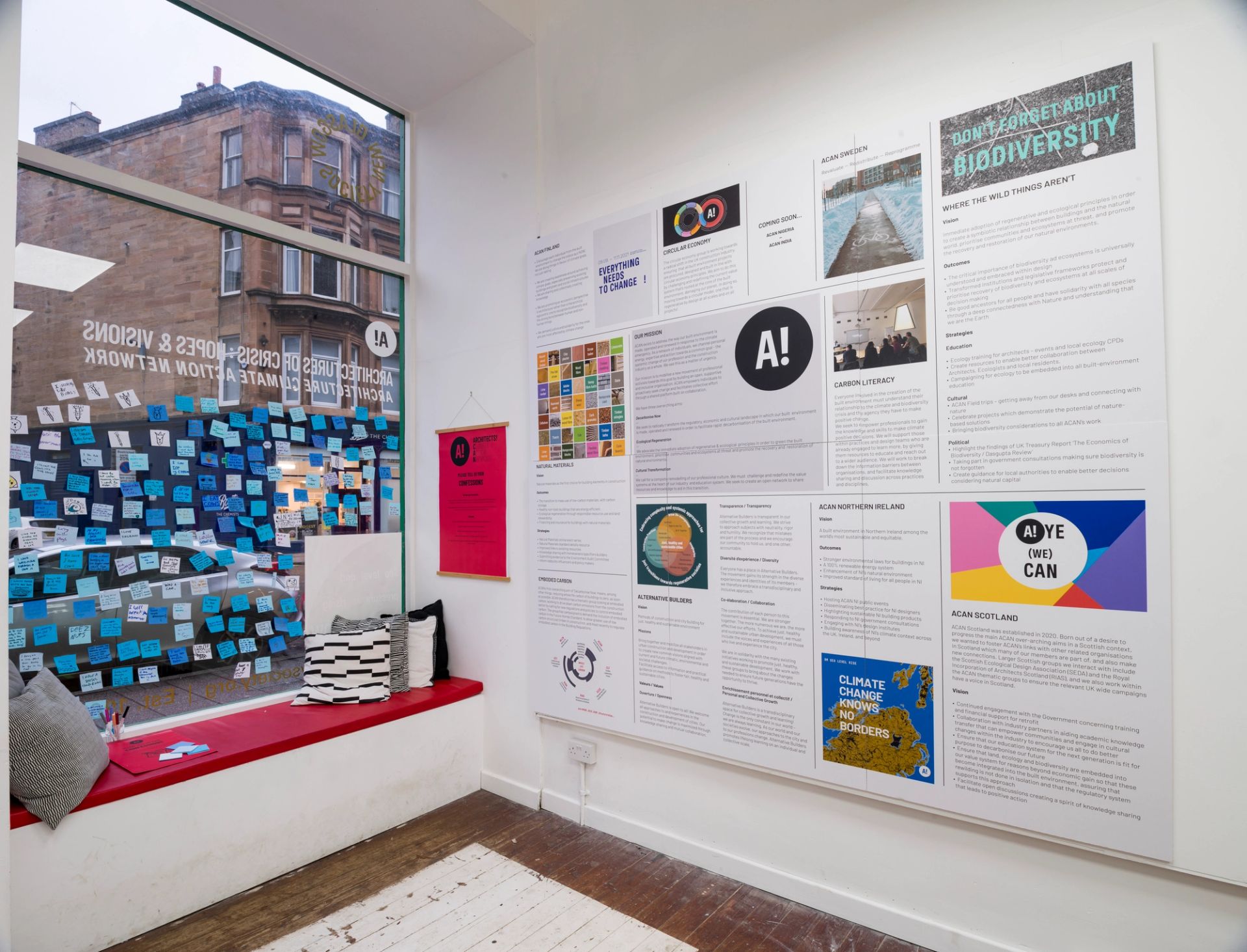 Thanks to Thierry Lye of New Glasgow Society we were given an exhibition venue which allowed us to promote the different strands of work at ACAN (such as our groups’ Education, Natural Materials, and biodiversity group “Where the Wild Things Aren’t”), our international ACAN chapters (ACAN’s Scotland, Sweden, Finland, Northern Ireland) as well collectives such as Re-Fabricate, France’s Climate Collage and Alternative Builders.