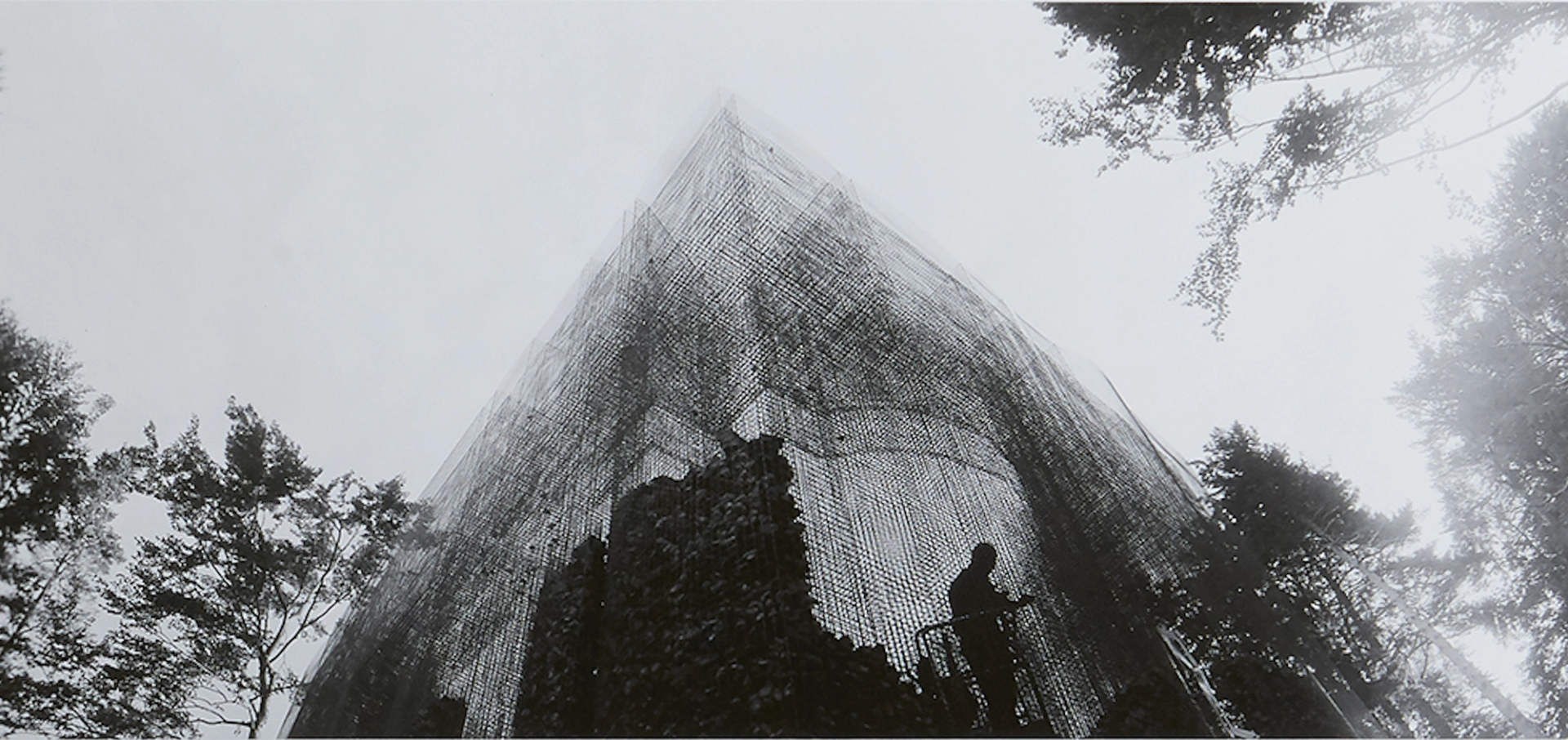 ET For me this space is testament to a continuously evolving research on the relationship between art, nature and man. As such when approaching the site, I did not feel bound to a common language, but rather a common theme which was each time explored as a direct reflection of the time and space which enveloped the artist. In this sense, the industrial materials I work with, which are very common and typical of our contemporary word, are a strong statement to the way we construct today. The mesh as a material belongs to the language of a globalized construction economy, one which has enabled me to access the product both in sites as Dubai or Trentino. This awareness undoubtedly informed the narrative of the project we developed.