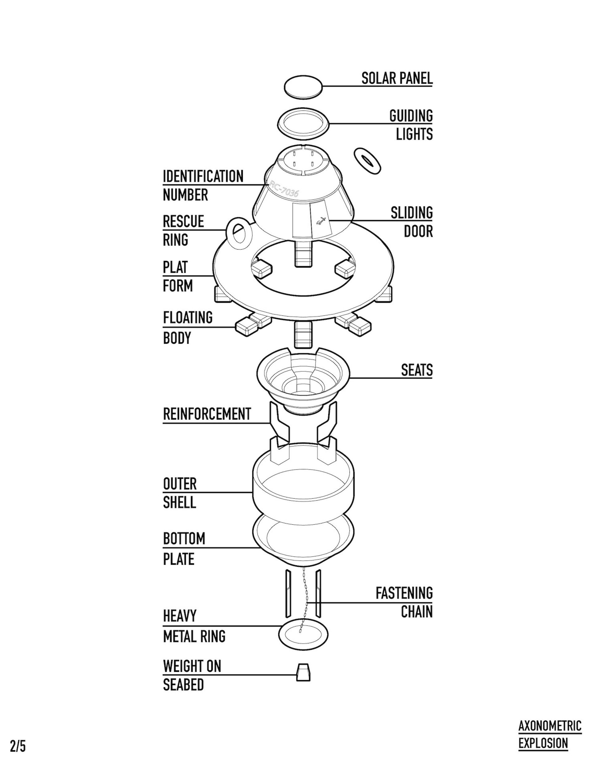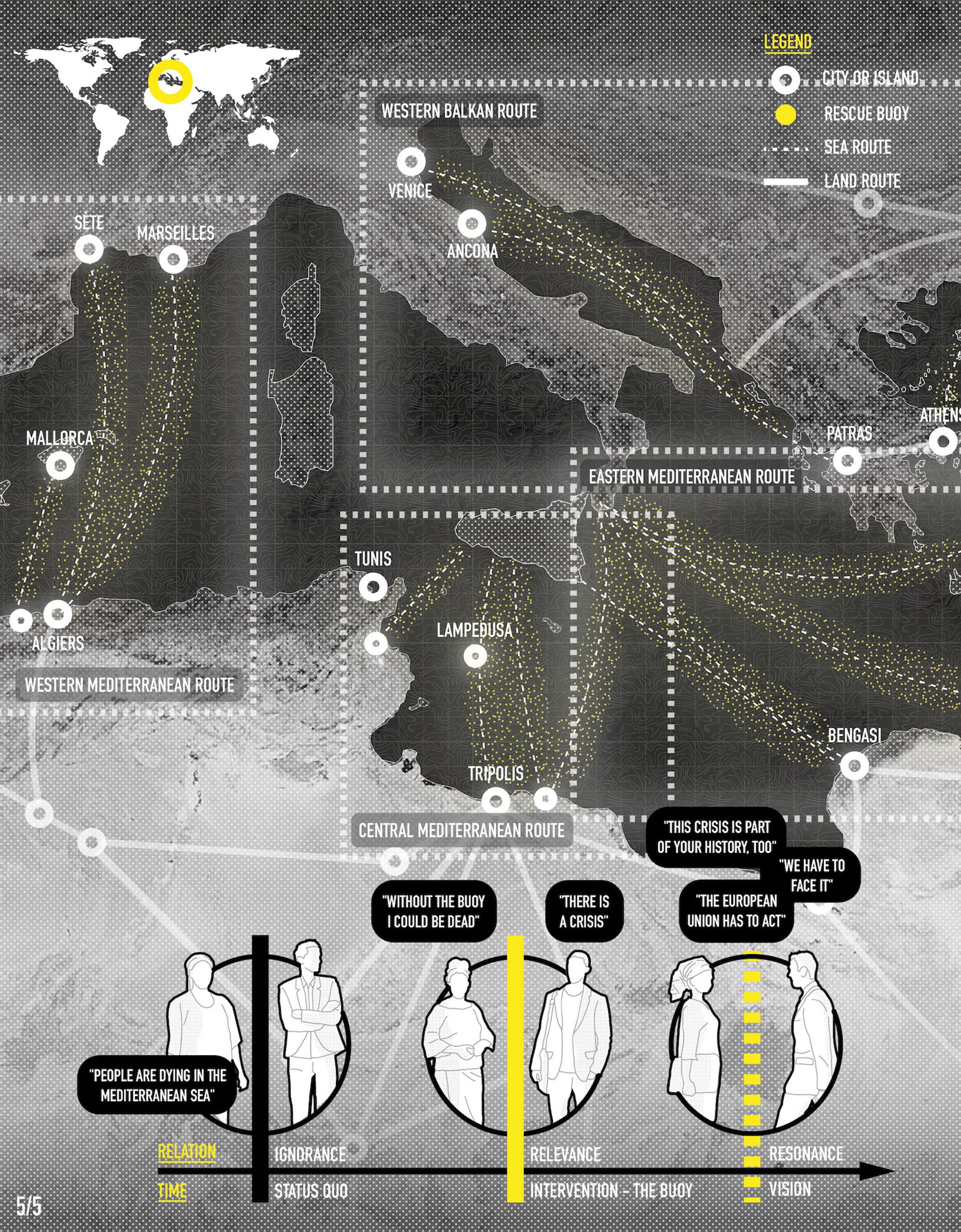 Modern crisis, caused by wars, climate catastrophes or social and economic precarity, force people to flee. In this context borderlands have to be seen as new typologies of space often limiting transit flows of migration. One of the urgently discussed issues of our time is the refugee crisis in the Mediterranean Sea. This maritime borderland has become a space of political trials of strength, causing state crime and the violation of human rights. Our main idea was to make this crisis visible by designing a buoy that can be seen as a space of rescue but also as a memorial.