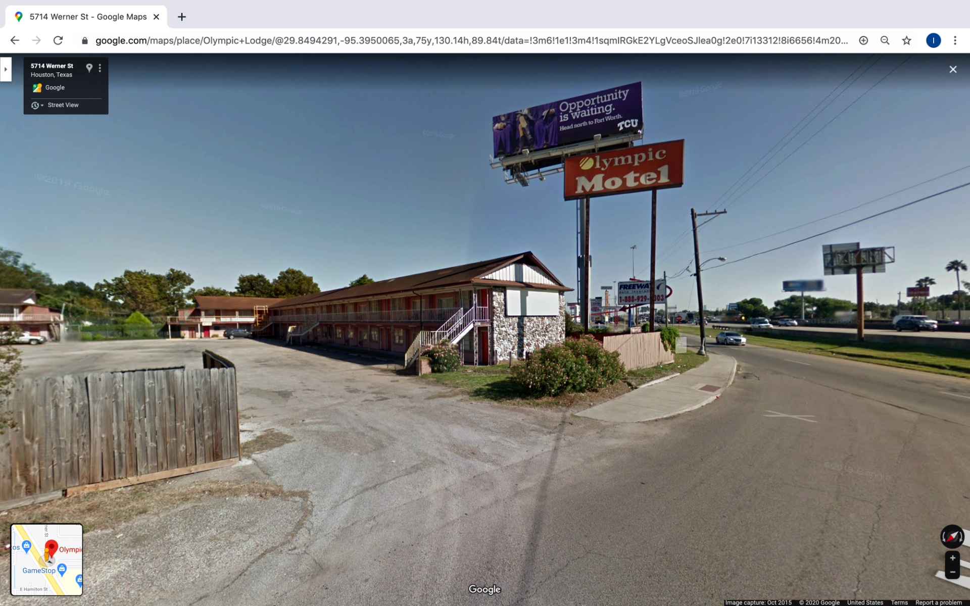 Olympic Motel at 5714 Werner Street, along the North Freeway, Houston, TX 77079, pictured here with a billboard advertisement from Texas Christian University that reads “Opportunity is Waiting.” © Google Street View 2015.