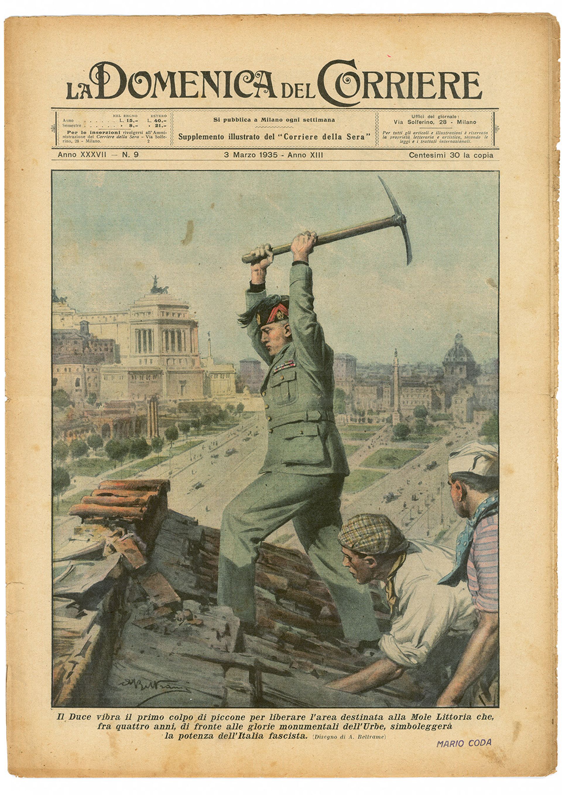 The cover of La Domenica del Corriere from 3 March 1935, showing Mussolini kicking off the demolition of a building in Rome to make way for new construction