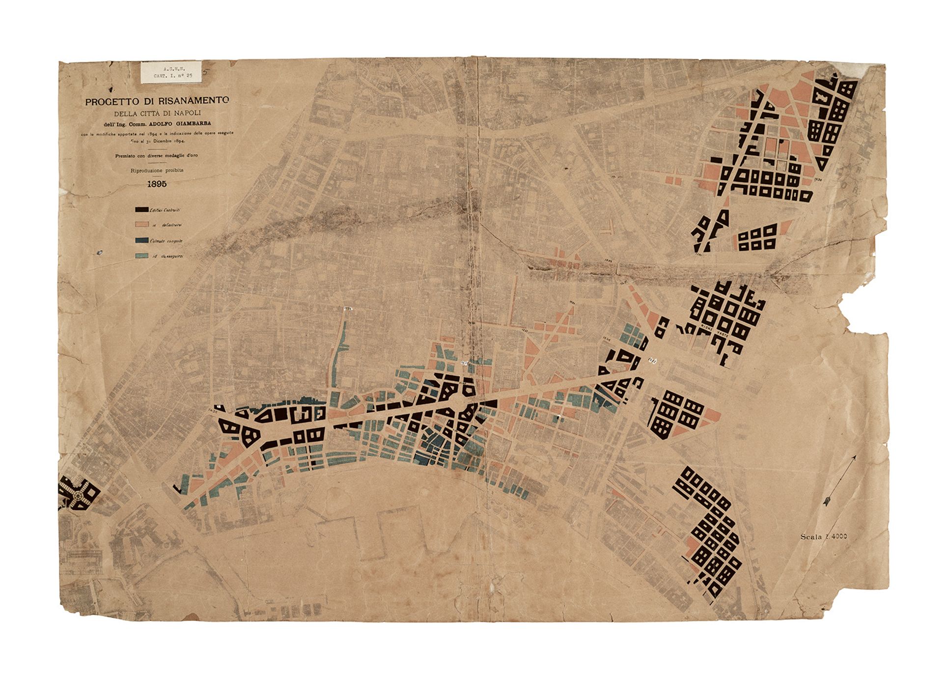 The Risanamento masterplan showing the state of construction works in 1895. Areas in black are already built, while those in other colours are under construction