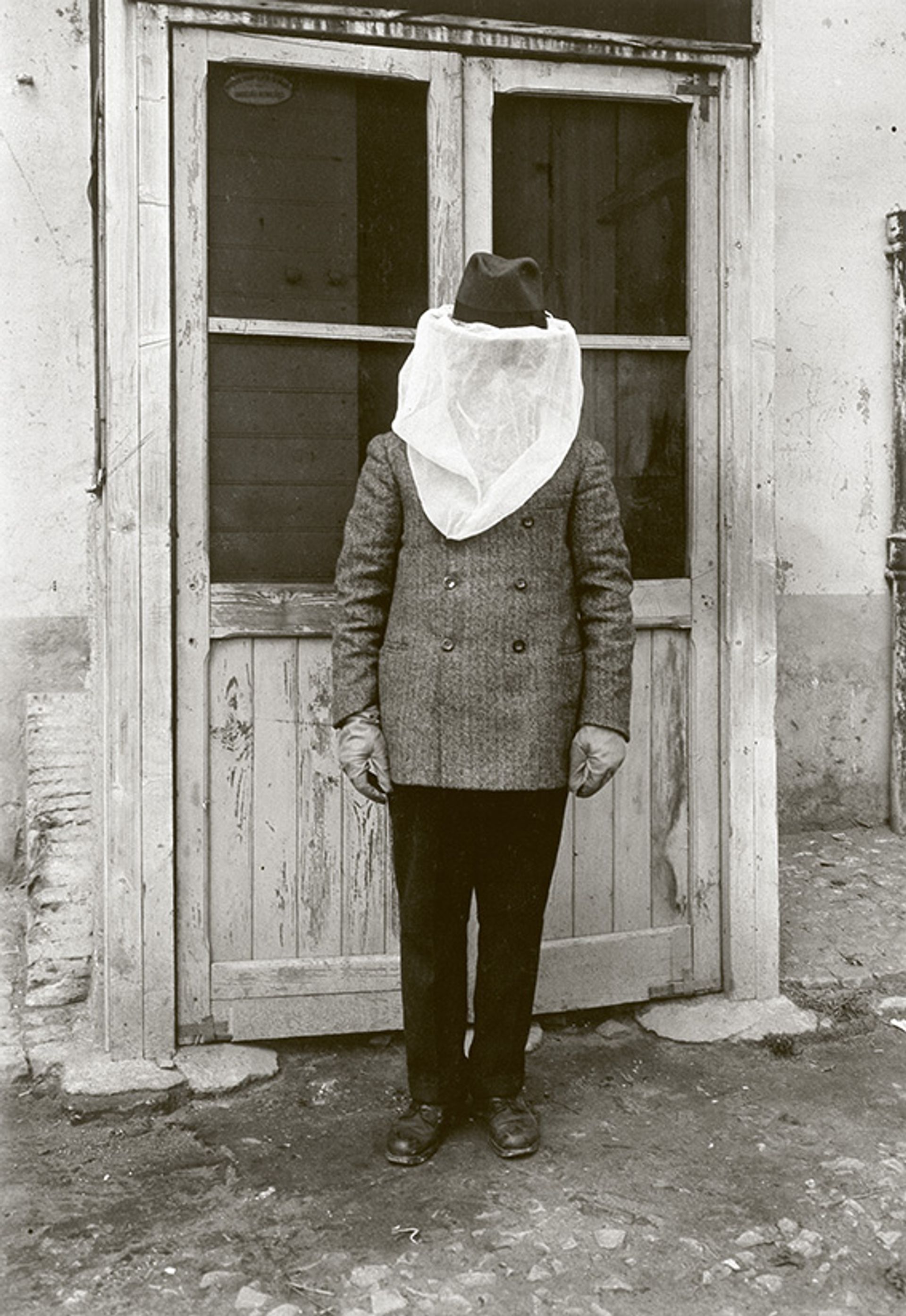 A demonstration of personal protective equipment against mosquitoes in the Pontine Marshes, ca. 1920